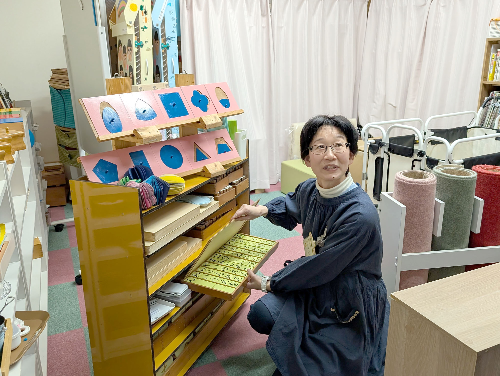 子どもたちが来園すると、言語の棚や感覚教育など、さまざまな分野の教材が準備されてあります。